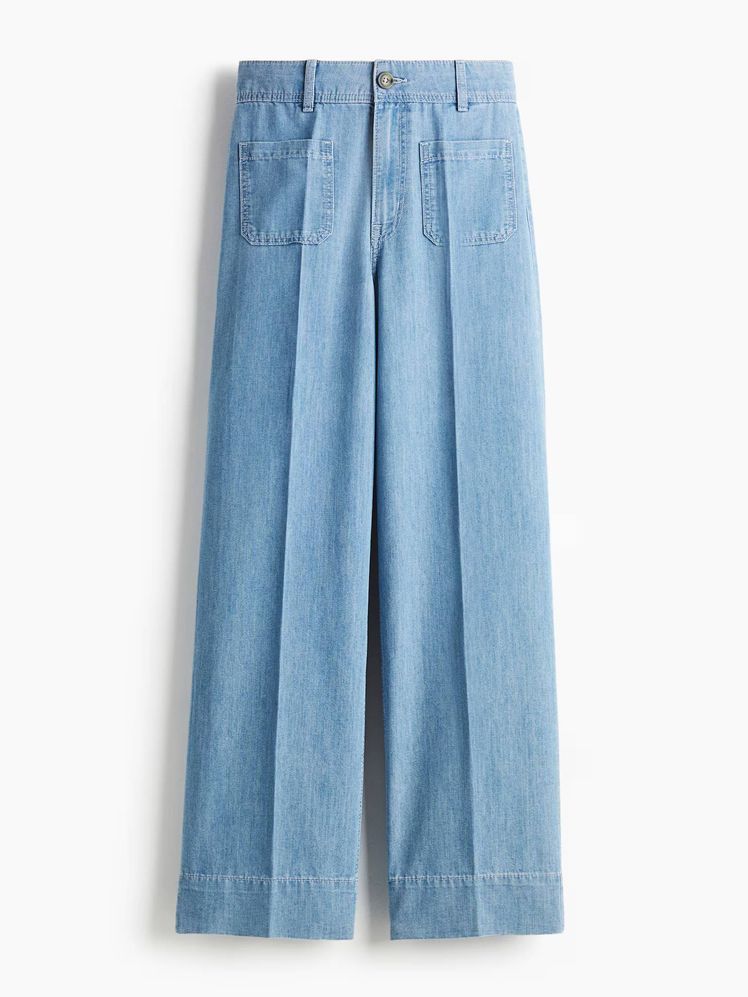El regreso del boho chic no solo implica vestidos de aires setenteros o blusas románticas de manga larga también uno de los modelos de pantalones vaqueros más representativos de esta corriente: los tipo wide leg (preferiblemente) con raya frontal y rematados con dos bolsillos frontales a ambos lados de la cadera.