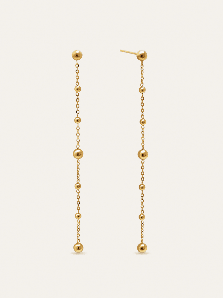 Los pendientes dorados largos de Singularu aportan luz al rostro y encajan a la perfección con el aire sofisticado del conjunto. Son sencillos, pero lo suficientemente especiales como para marcar la diferencia.