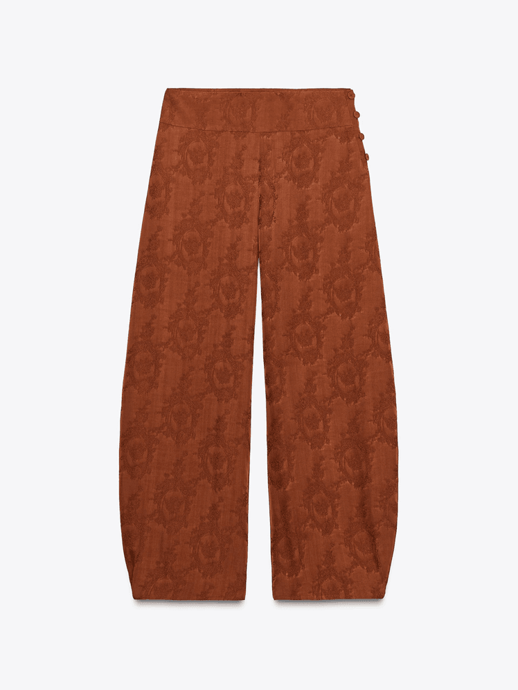 El tejido jacquard le da un aire sofisticado y festivo, perfecto para una noche tan especial como Nochebuena, mientras que el pantalón balloon aporta comodidad y un toque actual ya que esta forma de pantalón está en tendencia. Es ese tipo de conjunto que habla por sí solo.