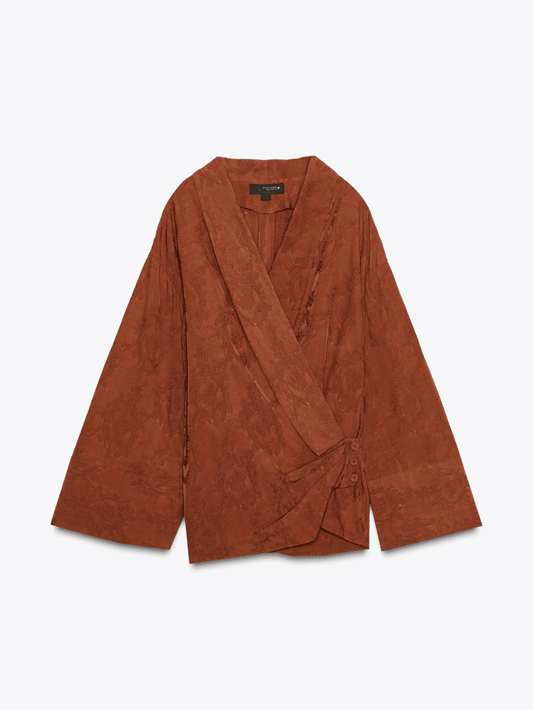 El punto de partida es este conjunto jacquard de Zara formado por kimono y pantalón balloon a juego. Llevar un total look siempre es una buena idea porque estiliza y resulta muy fácil de combinar.