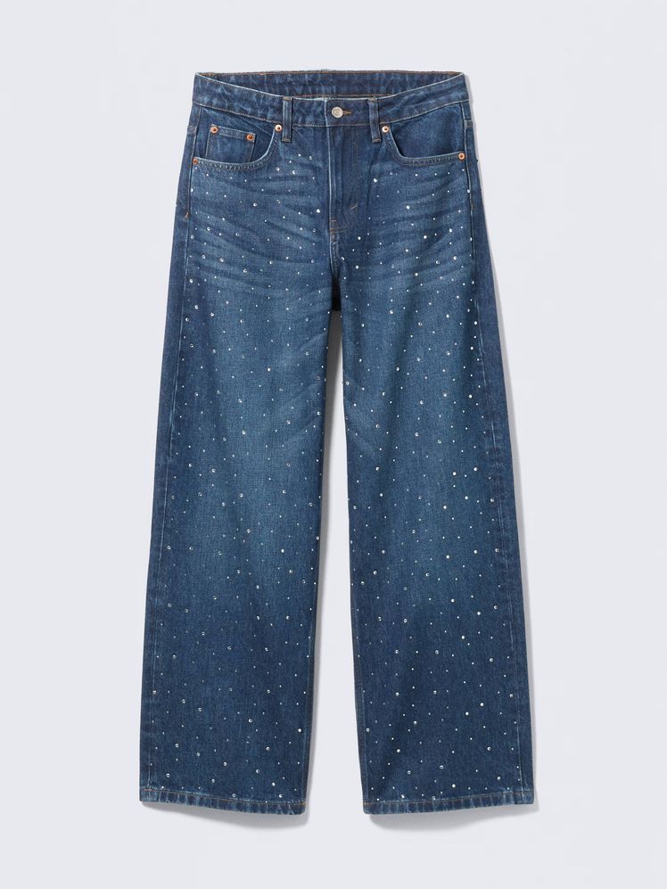 Un recurso cada vez más presente en los pantalones vaqueros son los detalles de strass, especialmente repartidos a lo largo de toda la prenda de manera uniform. Y, coincidencia o no, es en el formato wide leg donde más abundan los jeasn con strass que ya se posicionan como los mejores vaqueros para salir de fiesta, aunque no solo están reservados para tal fin.